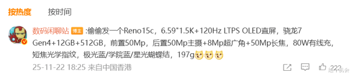 oppo reno 15C的综合配置大致都很清晰了,这次还是主打影像和轻薄高颜值,影像方面采用前置5000万像素主摄,后置5000万像素索尼LYT600光学防抖主摄+800万像素超广角镜头+5000万像素三星JN5长焦镜头,这规格与上代几乎一样,机身长宽厚是158mm、74.83mm、7.77mm,重量约197g,比上代reno 14会更重一点、更厚一点,不过依然有轻薄体验。