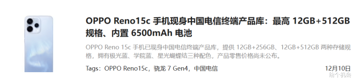 之前博主数码闲聊站就爆料了oppo reno 15C,采用6.59英寸中直屏,近期又得到了爆料,据IT之家的消息透露,oppo reno 15C手机已经现身中国电信终端产品库,提供12G+256G、12G+512G两种存储规格,拥有极光蓝、学院蓝、星光蝴蝶结三种配色,不过定价还没公布,要等12月底发布才知道,但此前oppo官方有说过定位入门级别,价格应该不会很高。