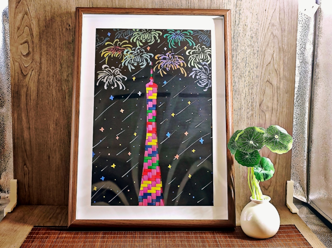 简介:这个竹编作品巧妙地将传统竹编工艺、广州塔现代地标与绘画艺术巧妙融合,展现了独特的艺术魅力。广州塔采用了人字纹的编法,利用竹条的柔韧性和可塑性,通过经纬交织形成图案。与丙烯马克笔绘制的烟花星空背景相融合,既展现竹编的技艺魅力,又赋予作品地域文化与现代审美。