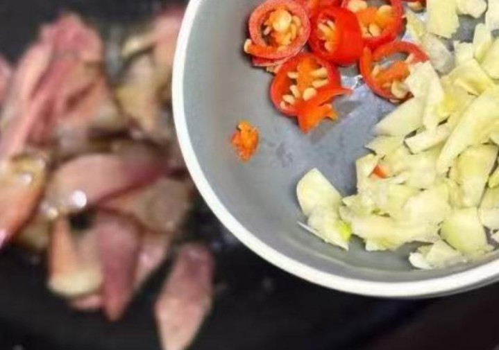 3、藜蒿洗净切小段、腊肉洗净切片。腊肉洗净切片、辣椒和大蒜洗净切碎待用。
