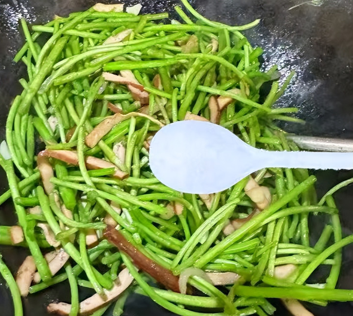 6、下入藜蒿段一起翻炒均匀。