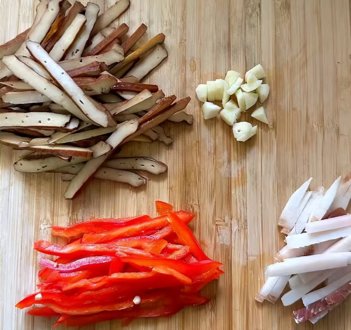 4、香干洗净切丝、红椒洗净切丝、少许腊肉洗净切小条、大蒜洗净切蒜粒。