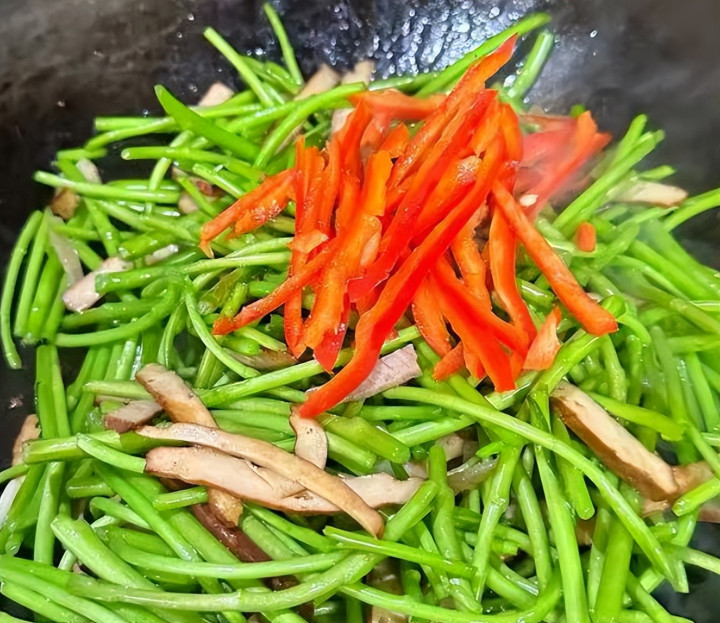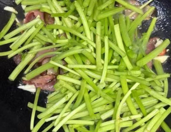 6、下入藜蒿一起翻炒均匀,炒至食材断生即可。