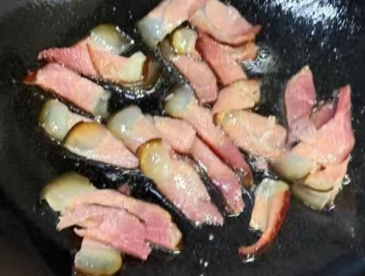 4、锅烧热,下入腊肉煸炒,腊肉炒香出油。