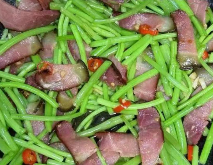 食材:藜蒿、腊肉、大蒜、辣椒。