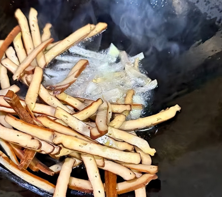 5、热锅凉油,下入猪腊肉炒出油脂,下入大蒜一起爆香,下入香干一起炒香。