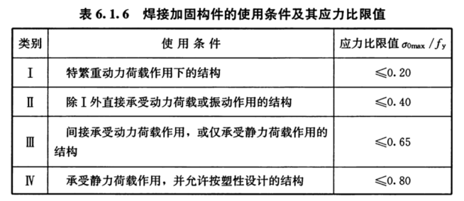 依据《钢结构加固设计标准》GB 51367-2019第6.1.6条,负荷状态下,钢构件的焊接加固,应根据原构件的使用条件,校核其最大名义应力б0max是否符合表6.1.6应力比限值的规定。若不符合规定时,不得在负荷状态下进行焊接加固。