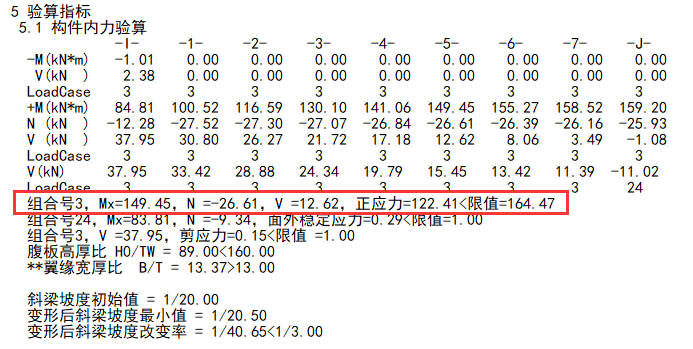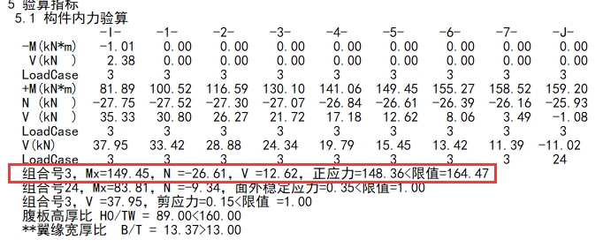 进一步查看其构件信息,正应力=148.36<限值=164.4。