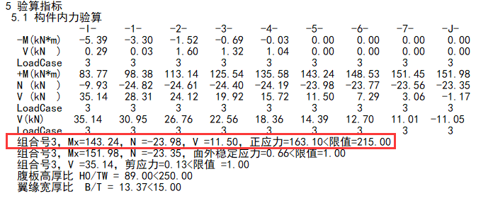 查看其构件信息,正应力=163.10<限值=215.00。