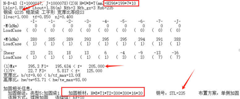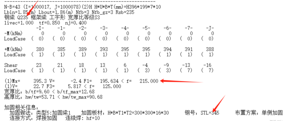 (2)加固后的承载力=164.47<初始承载力=215,这是由于加固后的钢梁强度按《钢结构加固设计标准》进行了折减。