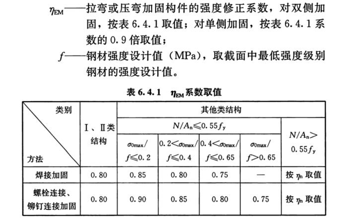 (2)当钢梁单侧加固时,强度修正系数ηm有可能低于表格限值。