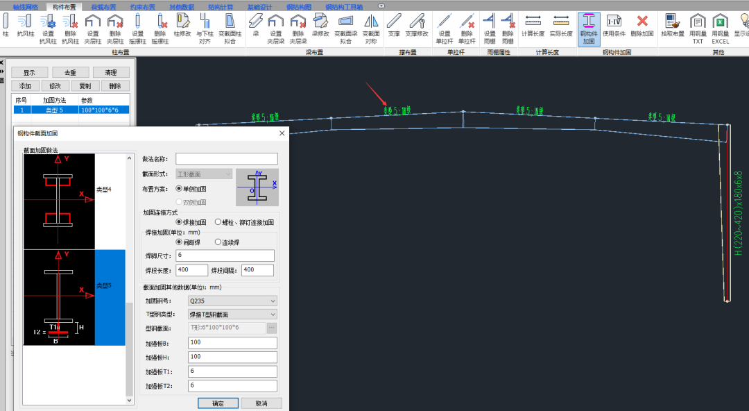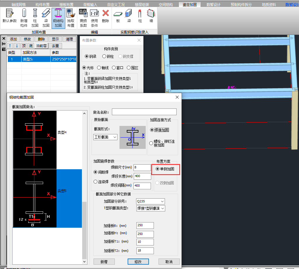 现对该钢梁布置加固类型5,勾选钢结构加固参数,进行加固计算。