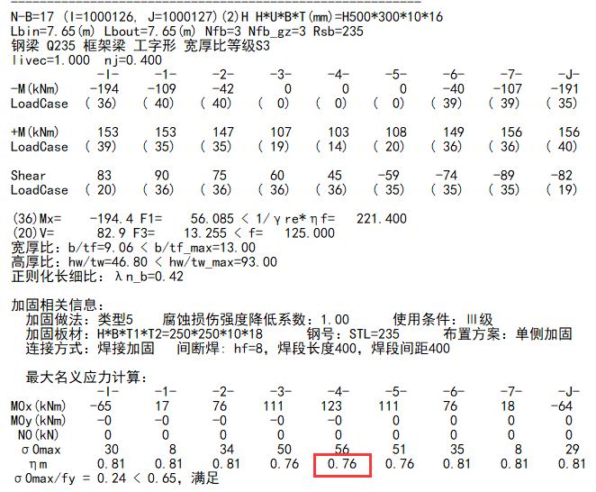 下图中的钢梁加固计算完成后,查看构件信息,其中第4截面的强度修正系数ηm=0.76。