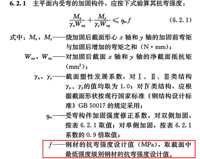 依据《钢结构加固设计标准》6.2.1条,钢材的抗弯强度设计值,取截面中最低强度级别钢材的抗弯强度设计值。