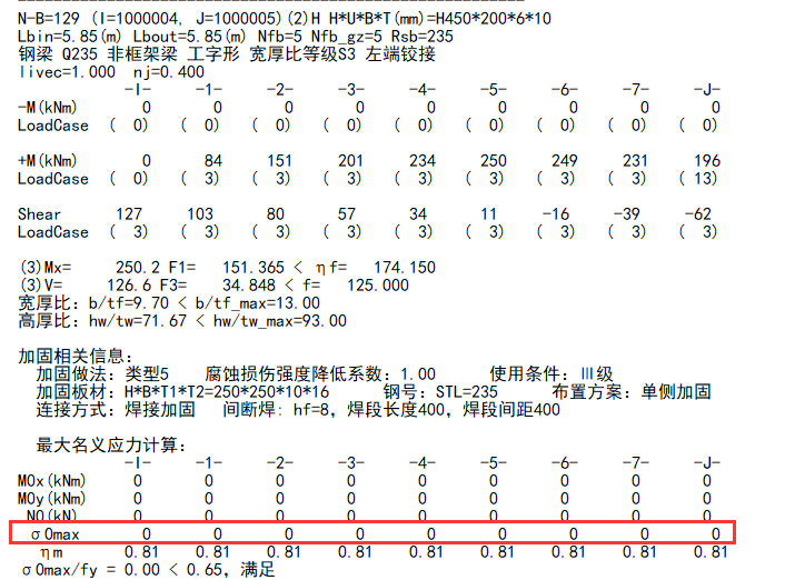 注:构件信息输出的б0max/fy是判断名义应力是否适合焊接加固的,而强度修正系数的判断条件是б0max/f,两者是不相同的。