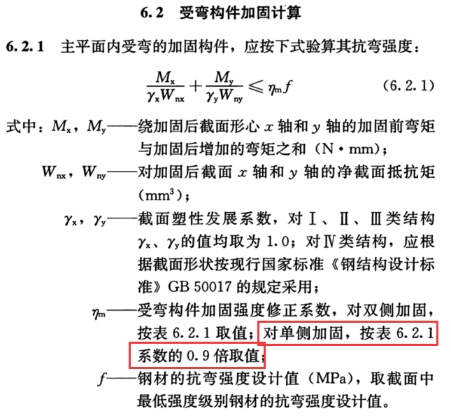 根据《钢结构加固设计标准》6.2.1条,受弯构件加固强度修正系数,对于双侧加固,按表6.2.1取值;对于单侧加固,按表6.2.1系数的0.9倍取值。