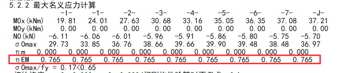 查看构件信息中的名义应力输出内容,可看到该钢梁的强度修正系数为0.765。0.765x215=164.47。