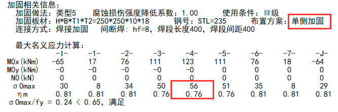 针对这种情况,可适当增大加固尺寸以降低应力的数值,从而减小应力比。如对该梁的加固尺寸由100、100、6、6改为150、150、12、12,重新进行加固计算。