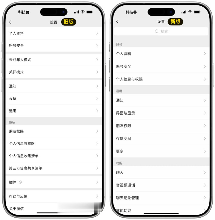 这次热更新中,iOS 微信对设置页面进行了重新梳理,把原本零散的选项整合成更清晰的分类,有账号、通用、功能等几个大类。同时,设置页面顶部新增了独立的搜索入口,可以快速找到需要的设置项目,省心不少。