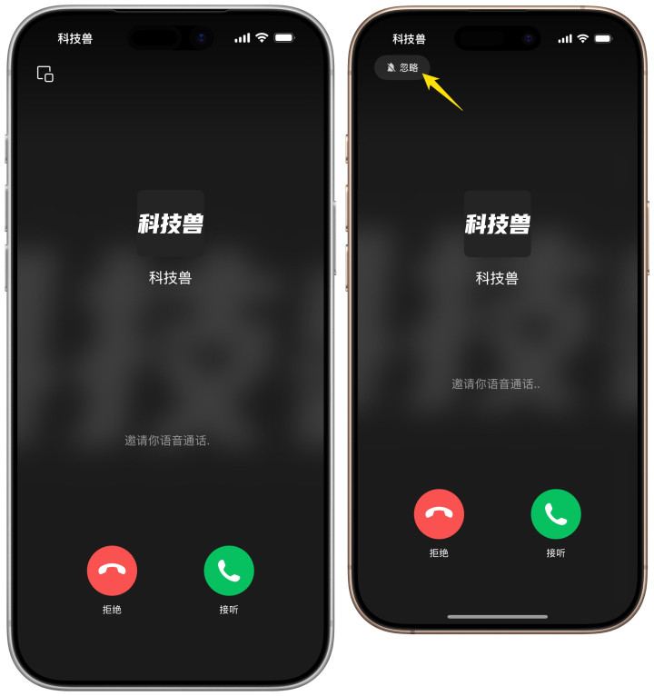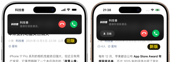 这一逻辑也同步到了全屏来电界面,旧版本中位于左上角的浮窗按钮,现在统一被替换为「忽略」按钮: