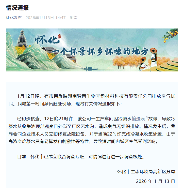 1月13日,据怀化发布,怀化市生态环境局高新区分局发布情况通报。